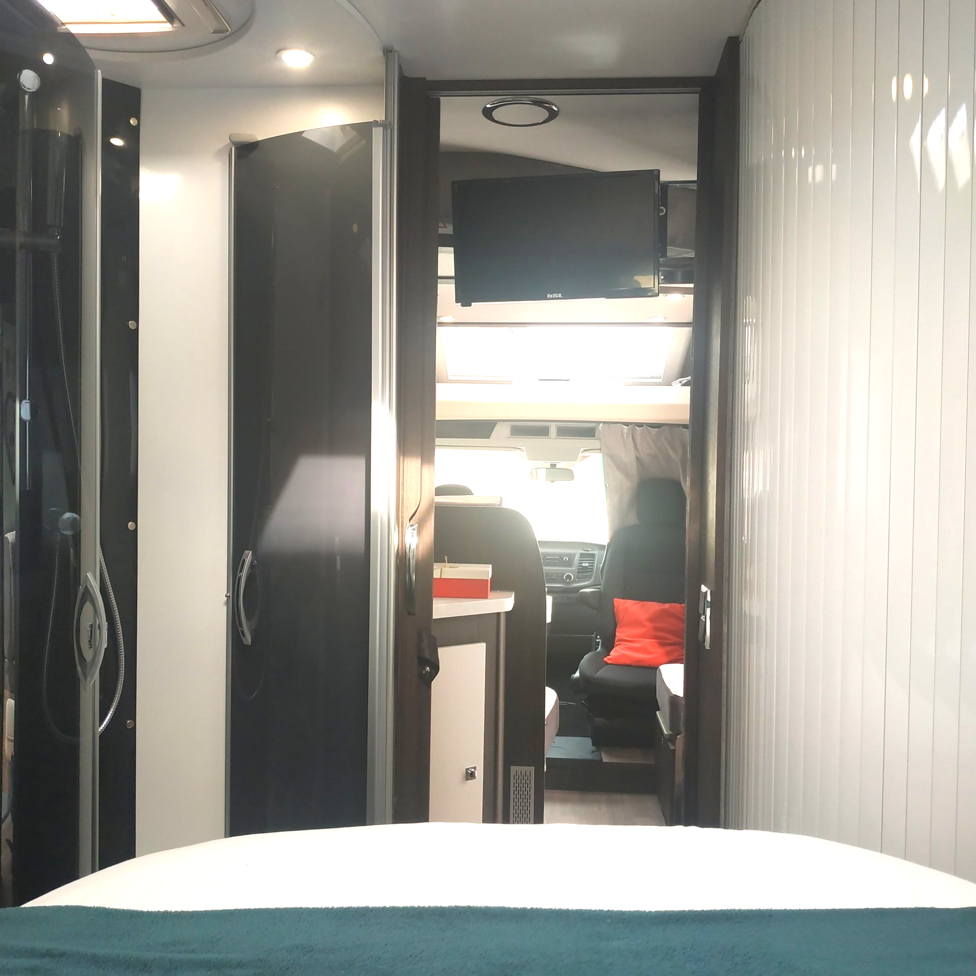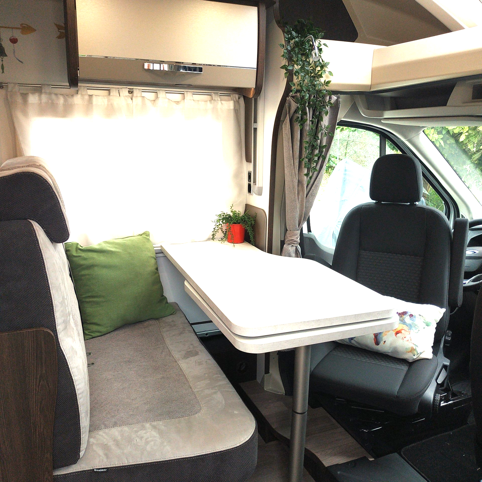The A HAPPY VAN island bed motorhome. It welcomes up to 5 adults, both to travel and to sleep. Perfect for a couple, two, or for a couple with children. It is the smallest in dimensions, and the newest. Registered in January 2020. The chassis of this motorhome is a Ford Euro 6d 2.0, and it has a 130hp diesel engine that no one would tell when you drive it, but that consumes less. Measuring 6.99 m long, it is very easy to carry, and being profiled, we find less height limitations and fuel consumption is also reduced. To facilitate maneuvering and parking, it has reversing sensors. It also has air conditioning in the cabin, and auxiliary audio input through 3.5 ”Jack and USB. With regard to housing, highlight its complete equipment so that you do not need to carry more than your personal belongings. Completely autonomous, it has solar panels, a 120-liter clean water tank, hot water and heating. To enjoy the outdoors, it has garden equipment and an awning. Regarding the interior and its distribution, the first thing we find when entering is the living room with capacity for 5 people, with great luminosity thanks to three windows and a large skylight over the cabin, and with the driver's and passenger's rotating seats. The table is extended to make it more spacious and that the 5 people are comfortable. The sleeping places in the living room are distributed with a single convertible bed in the seats and a double bed that comes down from the ceiling thanks to an electrical system. For your entertainment you will find a TV with a USB input and a pen drive with various movies, a set of board games, and even coloring books and pencils, or books to read. The kitchen is also in front of the front door, fully equipped with both crockery and kitchenware and in which it is worth highlighting the trivalent refrigerator with freezer and large capacity bottle rack (140L). It also has a gas stove with three burners. The L-shaped worktop and the covers on the burner and sink make the workspace spacious and functional. A Happy Van also puts at your disposal some courtesy products such as coffee, tea, cocoa, sugar, oil, salt and vinegar. The living room and kitchen are separated from the bedroom and the toilet area by a sliding door, and as soon as we cross it, we find ourselves in the bedroom with the island bed, where we also find the toilet area. The large independent shower, with screen, skylight and towel rail. And in front of it, the separate toilet with sliding door, with sink, toilet, mirror, skylight and furniture to store your belongings. Complimentary: toilet paper, bath gel and chemical tablets for the toilet. And as storage, two cabinets on the sides of the bed (one with shelves and the other with a pull-out bar and hangers to hang your clothes), 3 cabinets suspended over the beds where you will find shower towels, several cabinets in the kitchen and living room. for food or whatever you want to bring, and the large garage where you will find the necessary equipment for your trip, as well as a 120cm x 60cm table with chairs and a barbecue. Finally, it is worth mentioning that all the windows and skylights of the motorhome have blinds and mosquito nets, and an extra equipment included with all the necessary utensils for the motorhome, such as the 220w cable with extension cord and adapters, hose for filling the tank with water, gas cylinders, leveling wedges, first aid kit, puncture repair kit, tools, fire extinguisher, etc.