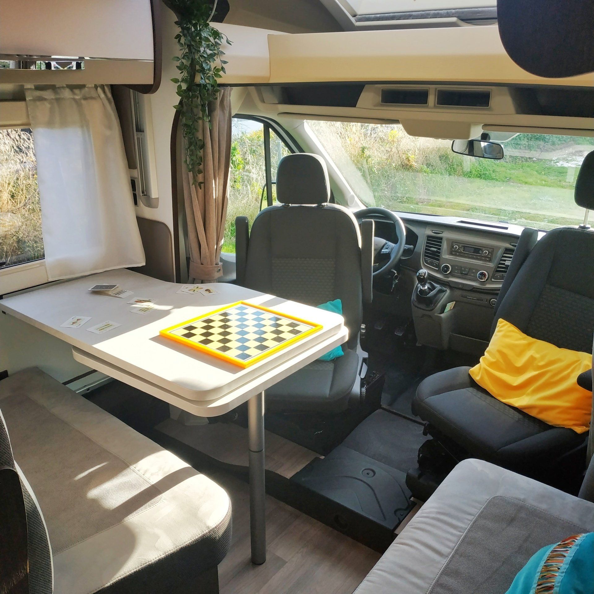 Châssis: Ford Euro 6d 2.0 175cv Nombre de places pour voyager: 5 sièges homologués Nombre de places pour dormir: 5 adultesMesures: longueur 7.48mMesure du lit suspendu 191 x 140 cmMesures des 2 lits jumeaux 188 x 85 cmMesures du lit converti King Size: 188 x 190 cm Dimensions du lit salon pliant: 210 x 90cm Toilette: WC chimique, lavabo et douche séparée Cuisine complète: brûleur 3 feux, évier et réfrigérateur trivalent de 140L avec porte-bouteilles et congélateur Réservoir eau propre: 105 L Réservoir eau grise: 105L