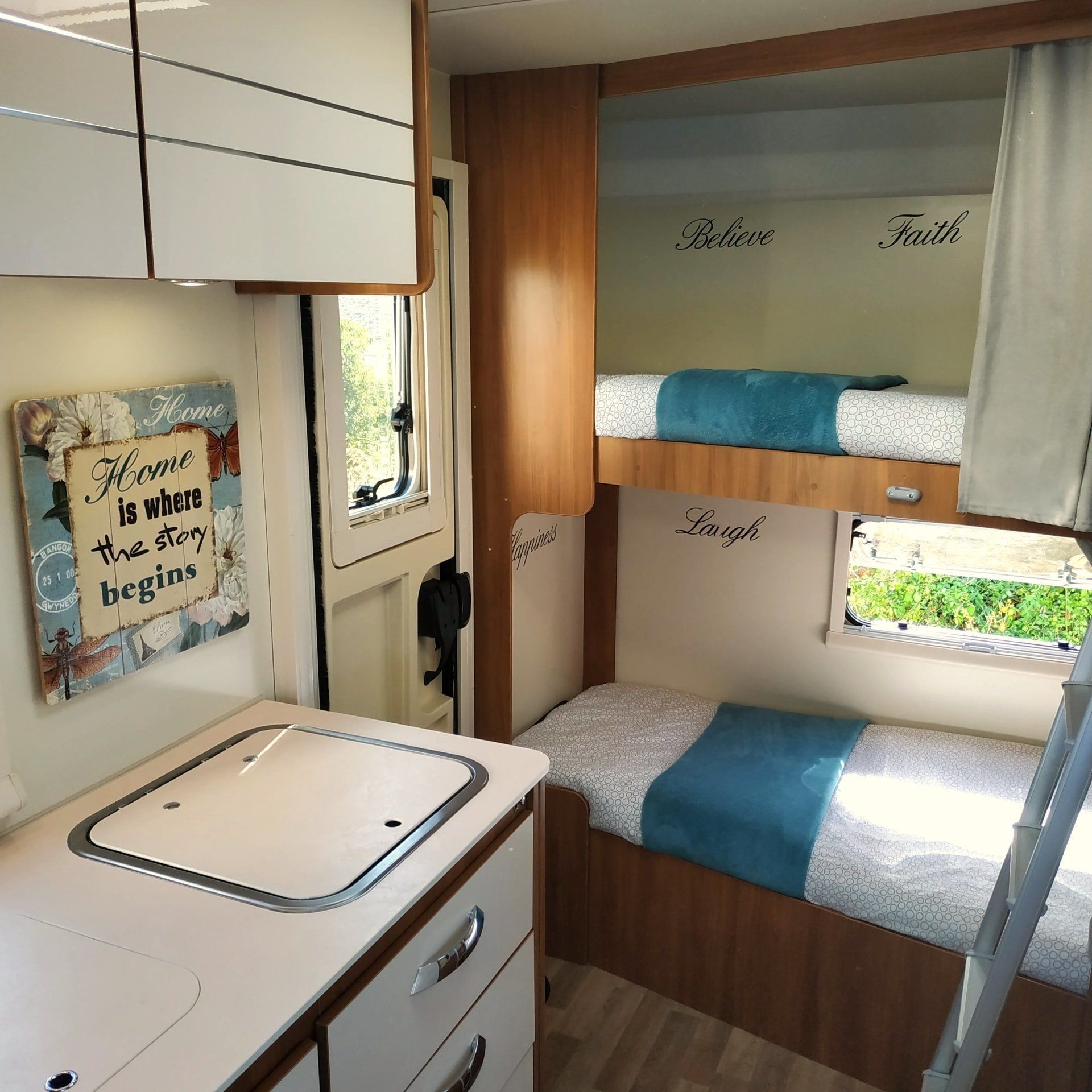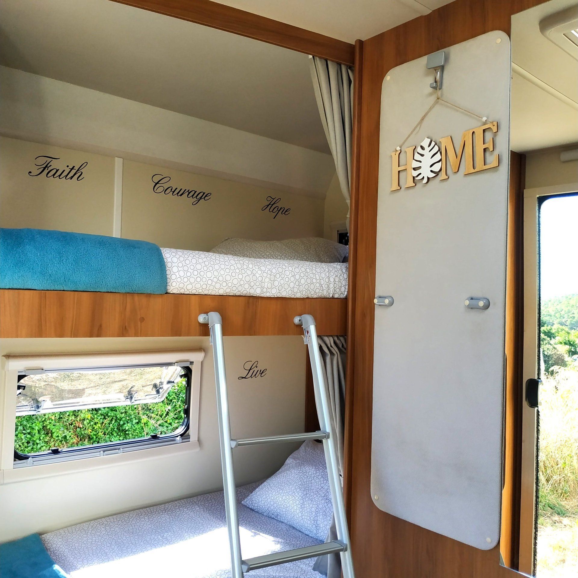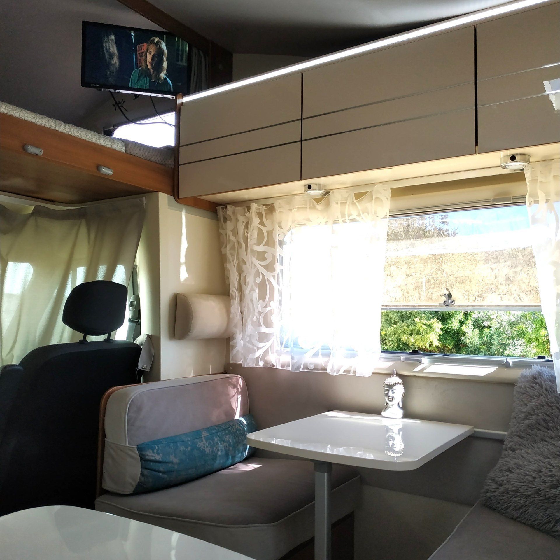 Le camping-car le plus spacieux de A HAPPY VAN. Il accueille jusqu'à 7 adultes, que ce soit pour voyager ou dormir. Sa largeur nous permet de nous déplacer librement et de nous croiser dans la salle sans nous entraver. Le châssis de ce camping-car est un Renault Master et il est équipé d’un moteur diesel de 175hp afin de ne pas lésiner sur la puissance. Malgré ses 7,5 m de long, il est facile à transporter. Sa caméra arrière est activée directement lorsque vous passez en marche arrière ou, si vous préférez, vous pouvez l’activer de sorte qu’elle soit toujours active en tant que rétroviseur. Il dispose également de la climatisation dans la cabine et d'une entrée audio auxiliaire via une prise jack 3,5 "et USB. En ce qui concerne le logement, mettez en valeur son équipement complet pour ne pas avoir à transporter plus que vos effets personnels. Entièrement autonome, il dispose de panneaux solaires, d’un réservoir d’eau propre de 100 litres, d’eau chaude et de chauffage. En ce qui concerne l'intérieur et sa répartition, les postes de couchage sont divisés en deux lits superposés, un lit double dans la capucine, un lit double et un lit simple convertible dans le salon. Pour manger, 6 places dans le salon et une table de 180x75 avec chaises et bancs pour l’extérieur, où nous avons aussi un barbecue et un auvent avec barre lumineuse à LED. Pour notre divertissement, deux téléviseurs USB avec une clé USB de films variés chacun, beaucoup de jeux de société et même des livres à colorier et des crayons ou des livres à lire. En ce qui concerne la cuisine entièrement équipée de la vaisselle et des ustensiles, mettez le réfrigérateur en évidence avec un congélateur trivalent de grande capacité (150 L). Il comprend également un brûleur à gaz avec trois incendies et certains produits complémentaires tels que café, thé, cacao, sucre, huile, sel et vinaigre. Le comptoir est large grâce à une table supplémentaire qui sort du tiroir et nous offre un espace de travail supplémentaire. La douche, grande, confortable et séparée par un écran, est indépendante du reste des toilettes. Un meuble au-dessus de la fenêtre et un autre sous l'évier offrent beaucoup d'espace de rangement. Il a également une grande fenêtre et un miroir. Gratuit: papier toilette, gel de bain et tablettes chimiques pour le WC. Et comme rangement, le placard, où vous trouverez des serviettes de douche et des cintres pour suspendre vos vêtements, et un entrepôt où vous pourrez ranger tout le matériel supplémentaire que vous devez transporter. Il convient de noter que cette cave peut être transformée en une grande où transporter même des vélos, en annulant le lit superposé bas. Enfin, mentionnons que toutes les fenêtres et les lanterneaux du camping-car sont équipés d’obscurateurs et de moustiquaires, ainsi que de la porte d’entrée de la maison et d’un équipement supplémentaire fourni avec tous les ustensiles nécessaires au camping-car, comme le câble 220 W avec rallonge. et adaptateurs, tuyau de remplissage du réservoir d’eau, bouteille de gaz, cales de mise à niveau, trousse de premiers soins, trousse de réparation de crevaison, outils, extincteur, etc.